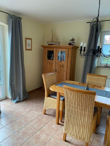 In dem Schrank befindet sich Leselektüre für die großen und Spiele für unsere kleinen Gäste.